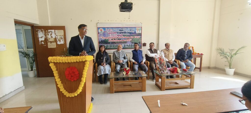 मुख्य परिसर के निदेशक एवं डीन प्रो. (डॉ.) पंकज कुमार शर्मा ने ट्रांजिशनल करिकुलम की संकल्पना, आवश्यकता और 15 दिवसीय इंडक्शन प्रोग्राम की शैक्षणिक उपयोगिता पर प्रकाश डाला। उन्होंने कहा कि आयुर्वेद केवल एक प्रोफेशन नहीं बल्कि मानवता की सेवा का माध्यम है। अष्टांग आयुर्वेद के सम्यक अध्ययन से विद्यार्थी चिकित्सा, शोध, औषध निर्माण, डिजिटल हेल्थकेयर तथा संबंधित क्षेत्रों में उत्कृष्ट अवसर प्राप्त कर सकते हैं। इस कार्यक्रम में वाइट कोट सेरेमनी के अंतर्गत विश्वविद्यालय के कुलपति एवं मुख्य अतिथि प्रश्न निदेशक द्वारा संयुक्त रूप से विद्यार्थियों को व्हाइट कोट(एप्रोन) प्रदान किया गया। तथा उत्तराखंड सरकार द्वारा चलाए जा रहे नशा मुक्ति देवभूमि अभियान के 5 वर्ष पूर्ण होने पर बच्चों को नशा मुक्ति के लिए भी जगरूप किया गया। तथा विद्यार्थियों ने नशा मुक्ति के लिए शपथ भी दिलाई गई।